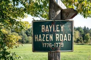 In the early years of the American Colonies’ revolt against English rule, Jacob Bayley of Newbury, Vermont, repeatedly wrote to General George Washington advocating for a road to be built from Fort Number Four in Charleston, New Hampshire, to St. John’s, Quebec (Saint-Jean-sur-Richelieu), as a route for invading Canada. It was believed by Washington and others that once an invasion force made its presence known, Canadians would revolt against their British oppressors. Along with Bayley, Moses Hazen constructed a road from Wells River, NH, to Hazen’s Notch, just west of Lowell, VT. With fears that the British would use the road to invade the colonies, and the eventual end of the war, construction ended in 1779 at Hazen’s Notch. The road was never used as a military road, but it did function to bring settlers into the newly established state of Vermont.